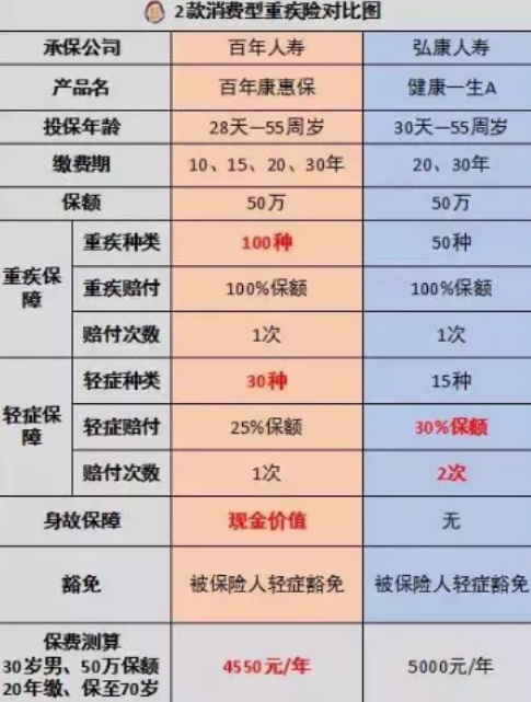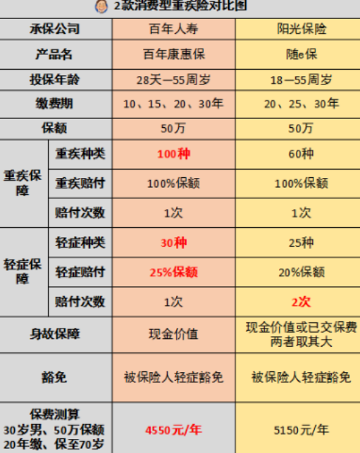 百年康惠保和陽光隨e保進行了比較。圖中的紅色字符是它們各自的優(yōu)點。