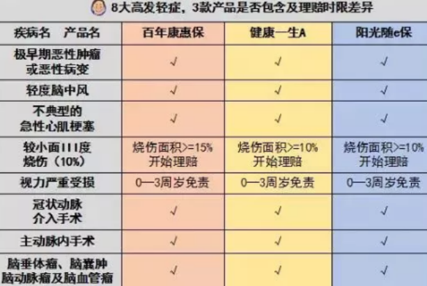 看來這三大產(chǎn)品的主要病癥、輕癥定義基本相同,輕癥中康惠保較小區(qū)域燒壞理賠比例,15%和10%實際上差別不大。