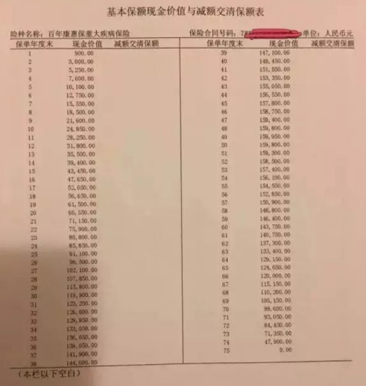 注意:百年康惠保的現(xiàn)金價值,上圖中的現(xiàn)金值表示每年可以返回的金額為退保的錢,減額交清則是在無法續(xù)交保費時,現(xiàn)金價值充當保費。